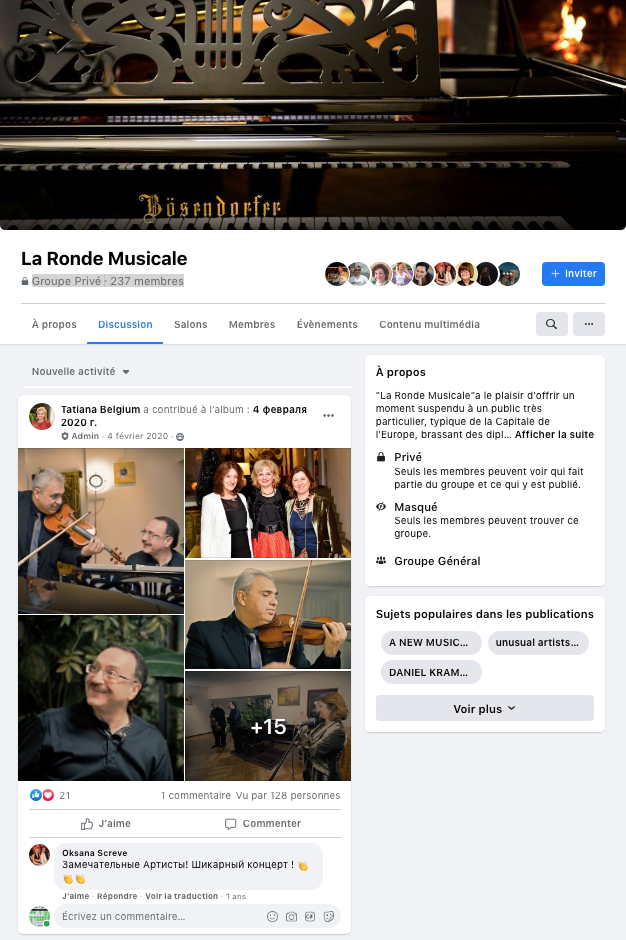 Tatiana et Oksana sont administrateurs. Groupe Privé · 237 membres « La Ronde Musicale » a le plaisir d'offrir un moment suspendu à un public très particulier, typique de la Capitale de l'Europe, brassant des diplomates et eurocrates, des bruxellois de souche et des expats, des étudiants et des artistes venus d'horizons différents. Lors de ces rencontres exclusives, les musiciens de renommée internationale enchantent ceux qui aiment profondément l’art de la musique.