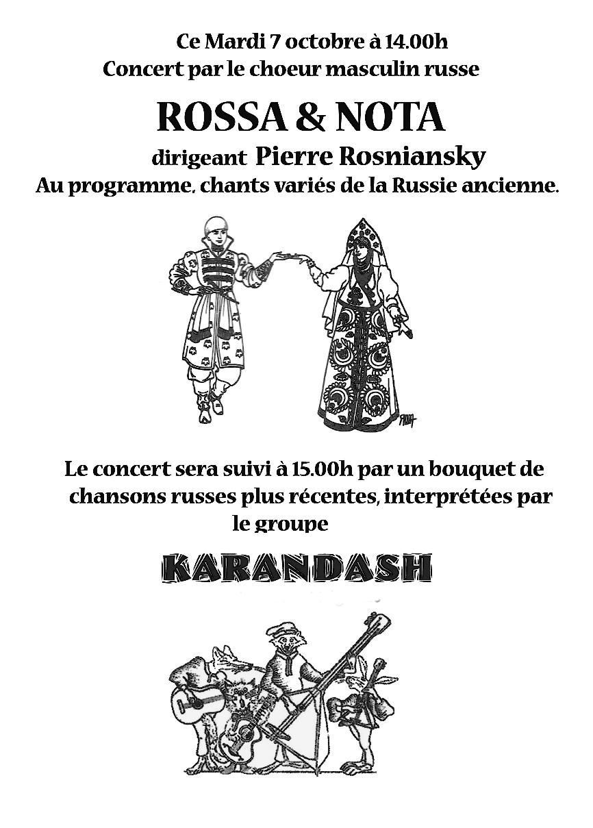 Deuxième concert de bienfaisance semi-privé donné par le chœur d'hommes « Rossa i Nota » placé sous la direction de Pierre Rosniansky à l'Institut Pachéco pour ses pensionnaires. Cette prestation sera suivie - et ce à la demande expresse de Nicolas Jigarëv, d'un petit intermède de musique variée russe, barde et tzigane, par Ilya, Ilyoucha Stepanow, Alexandre Chestopalov et Yasha Golembiowski (et leurs guitares). Note : la troisième version protégée du chansonnier R&N permet de générer des libretti à la demande lors de la programmation de concerts.