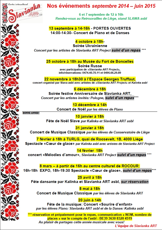 Renseignements par téléphone : 0496 66 29 89 après 18 heures ou courriel : slavianka.art at hotmail dot com Les paiements se font par période de 12 cours avec la communication : période, prénom de l'élève sur le compte de l'association : BE39 3630 8320 4519